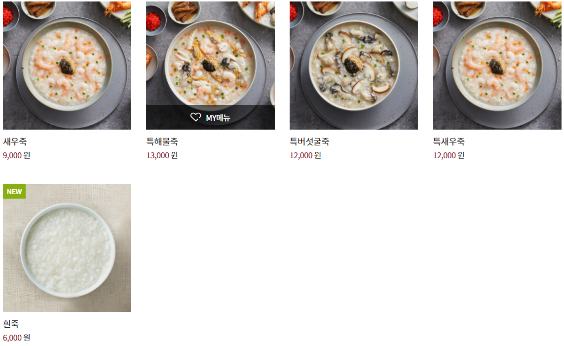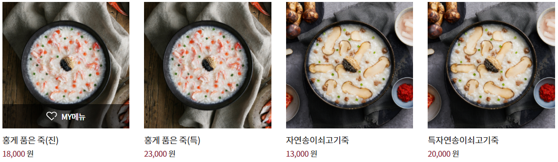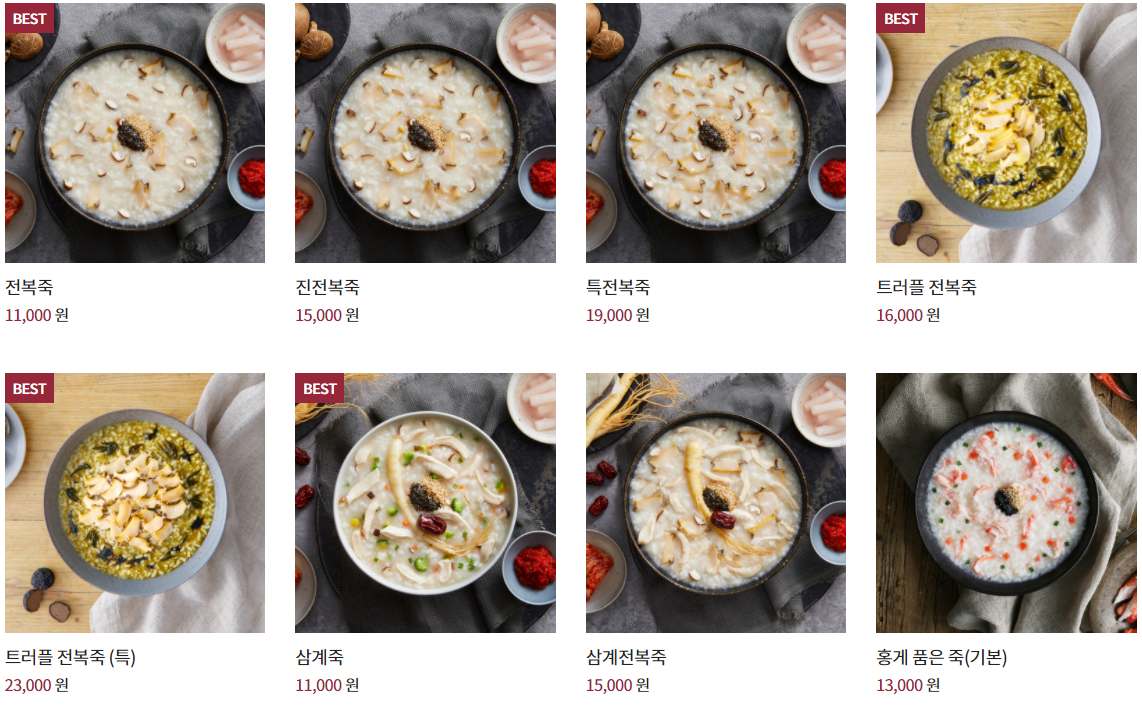 "전복죽, 트러플전복죽, 삼계죽, 쇠고기야채죽, 쇠고기버섯죽, 야채죽, 낙지김치죽, 단호박죽, 동지팥죽" 입니다.