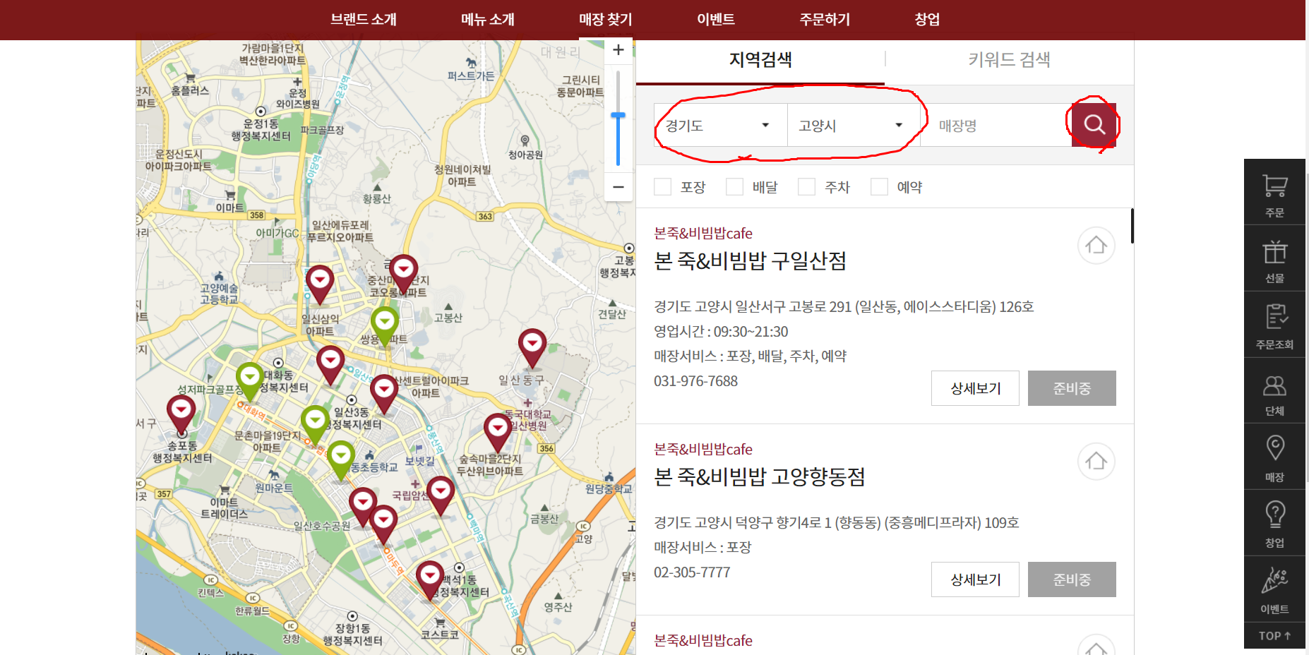 들어가 보시면 지역검색이나 키워드 검색이 가능하십니다. 저는 경기도 고양시를 검색해 보았는데요.