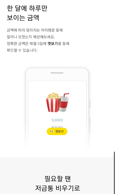 저축 금액에 따라 로또복권(5000원 이상), 팝콘 세트(9000원 이상), 패밀리레스토랑(4만4000원 이상), 홍삼 1상자(7만원 이상), 제주도 항공권(9만5000원~10만 원) 등 다양한 이미지 아이템을 보여줘 그동안 모은 금액의 수준만 짐작할 수 있게 해서 10만원 모일 때까지 조금 더 잘 기다릴 수 있을거 같아요.
