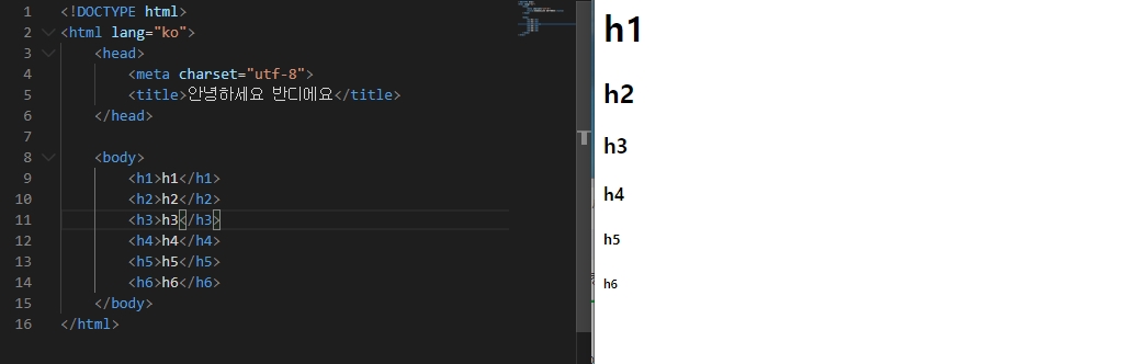 h뒤의 숫자에 따라 <h1>부터 <h6>까지 있으며