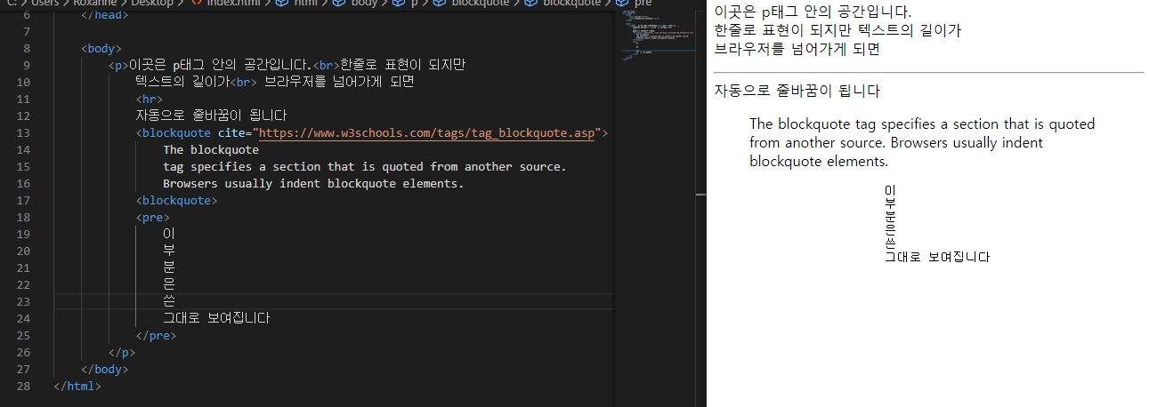 이 태그를 사용하면 다른 텍스트들과 다르게 안으로 들어써지게 됩니다.